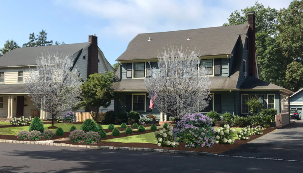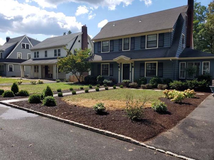 The owners of this charming Morristown home were dreaming of a new front garden design to match the style of their home… while removing as much lawn area as possible! Our Lead Designer, Erik, carefully laid out new beds wrapping around each side of the front yard with two different Panicle Hydrangeas, Spirea, Boxwood and Bloomerang® Dark Purple Reblooming Lilac. This layout created a much needed sense of enclosure while allowing space for additional plantings in the years to come.