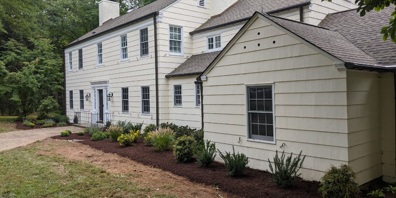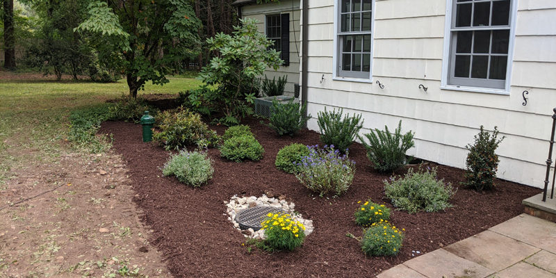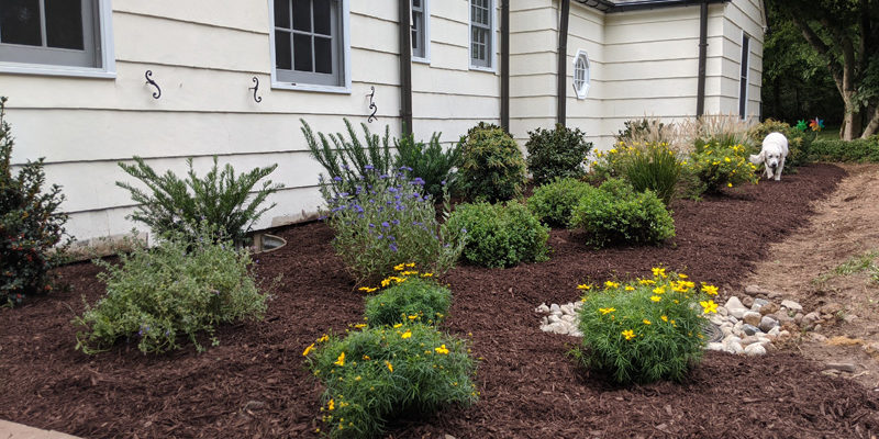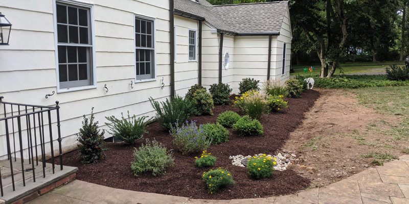 This nearby Harding Residence was in DESPERATE need of a makeover! After removing all the existing weeds and carefully re-grading the difficult slope leading up to the house with new drainage , Erik transformed the front entry sequence using clusters of Dark Knight Caryopteris, Threadleaf Coreopsis (great for clay soil), Walker’s Low Catmint and Dwarf Pennisetum along the sunny walkway. At both shady edges of the home, Erik filled with Raspberry Splash Lungwort, Coast Leucothoe, Leatherleaf Viburnum and Ostrich Ferns. The transformation speaks for itself!