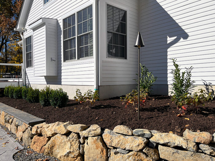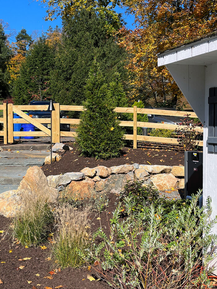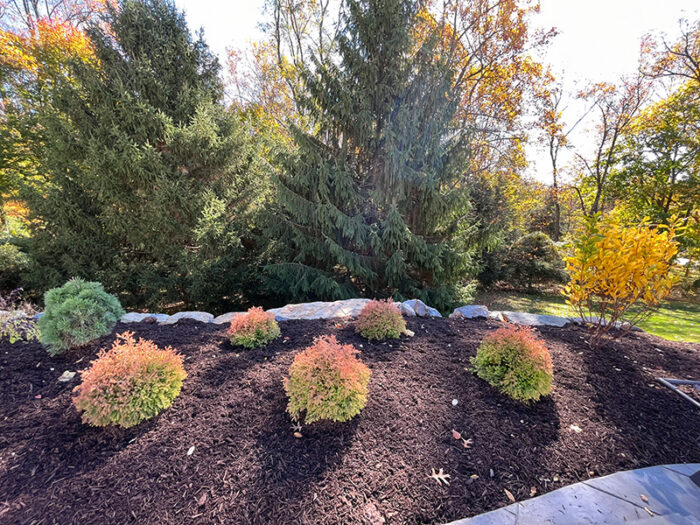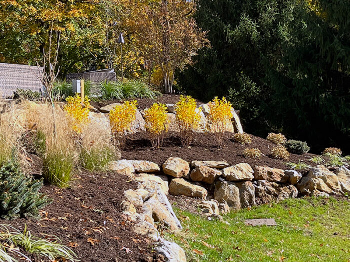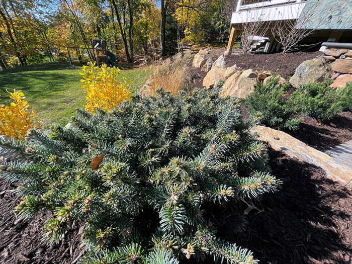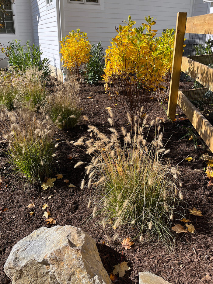 This backyard got a fun mix of plants, with a variety of textures and colors. This full sun planting plan was laid out so that flowering shrubs invite bees away from the pool, while evergreens and grasses surrounding the pool deck attract fewer stinging insects to address the family’s concerns while providing a welcome landscape throughout the winter, when the fire pit is in full use! Colorful variation of foliage, from blue spruce, firechief arborvitae, pink muhly grass, and dappled willow provide boosts of color around the pool.