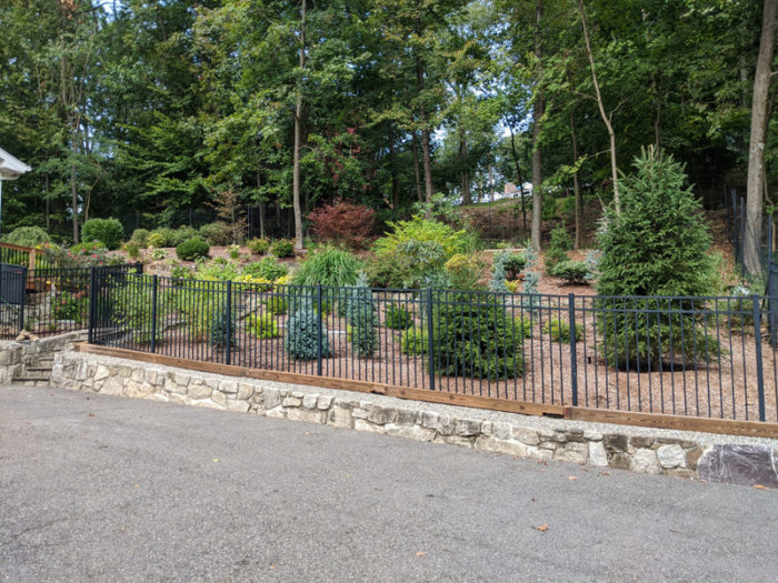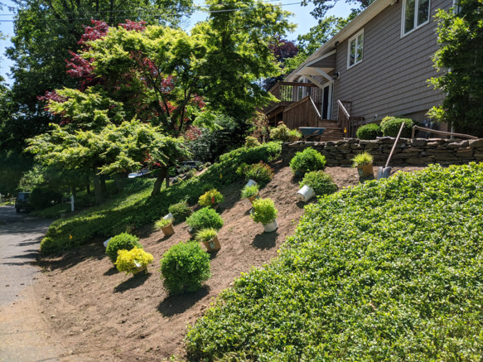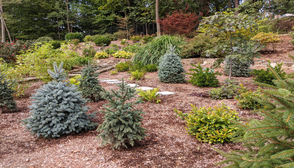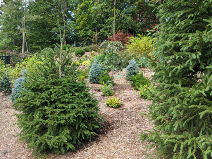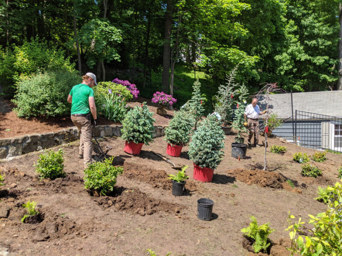 Our lead designer, Erik, was presented with an interesting challenge by one of our Morristown customers: Turn a useless lawn area into a whimsical spruce forest reminiscent of the Northwest. Erik started with 3 Norway Spruce for privacy and then filled in with clusters of Baby Blue Spruce, Oriental Spruce and Golden Oriental Spruce. The design was complemented with Horstmann Blue Atlas Cedar and a large Bloodgood Japanese Maple for more contrast in color. Finally, lower shrubs were added for seasonal color such as Red Twig Dogwood, Little Henry Itea, and Coast Leucothoe.