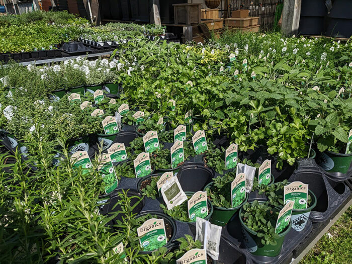 Our herb selection begins in March or April with cold-hardy varieties, weather permitting, and expands fully in early May with our complete lineup. Herbs are restocked weekly to ensure fresh, healthy plants all season long. You’ll also find a wide range of organic options from our friends at Peace Tree Farm. Available in flats, 4″ pots, and larger sizes, our herbs offer something for every gardener and every growing space.